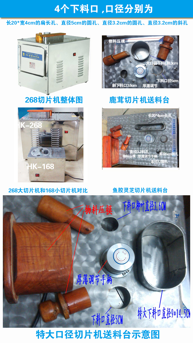 鱼胶、灵芝、天麻切片机 HK-268型系列大功率、加强型中药材切片机,可切成斜片,横片,直片,片片厚薄均匀,色泽美观。刀盘上装放 1.应用范围 本机器适用于药店、制剂室、科研单位、医院、门诊、小型药厂以及食品等行业。 2.工作原理: 本系列切片机是利用刀片切削的原理将物料切制成片状的设备,本机由机架、电机、刀片、转盘和片厚调节装置等组成, 物料放置在投料口中,在装在转盘上匀速旋转的刀片不断切削下,被切成片状。 3.特点 (1)机身外形美观、噪音低,操作简单,易清理。 (2)机器设计合理,配备单相电机,可切成直片(圆形)、斜片(柳叶形)、 横片(长片)。 (3)刀盘光滑、均匀、刀盘直径大,切片厚度可在0.3-3mm 范围内随意调节, 切片效率高,所切出的片形完整、美观、 厚薄均匀。 (4)刀片采用整体高速钢,经久耐用,切片范围广泛,如:黄芪、红参、三七、天麻、苏木、降香、生晒参、西洋参、 鹿尾、鹿茸、灵芝等均可切制。特别适 用于直径较大、或者需切长横状片的天麻、灵芝、鱼胶等药材、食品的切 片加工,以及大口径的淮山等的切片(切片效果详见下图)。