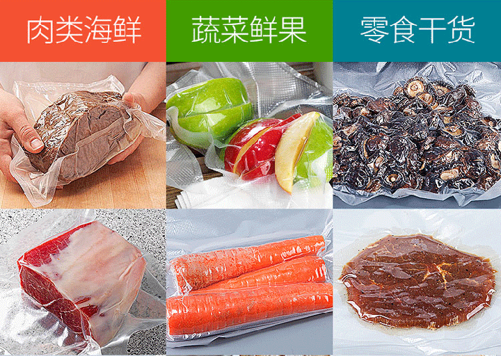 需要长时间保存的干鲜果品、茶叶、种子、生熟肉类、药品、电子器件、音像制品、照相机、毛料衣服、金银手饰等各类食品和物品,经真空包装后,可以有效的起到保鲜、保质、防霉变、防潮、防锈、防污染、防氧化及防污染,从而延长保存期。